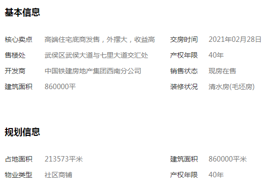 核心卖点高端住宅底商发售,外摆大,收益高交房时间2021年02月28日售楼处武侯区武侯大道与七里大道交汇处产权年限40年开发商中国铁建房地产集团西南分公司销售状态现房在售建筑面积860000平装修状况清水房(毛坯房)